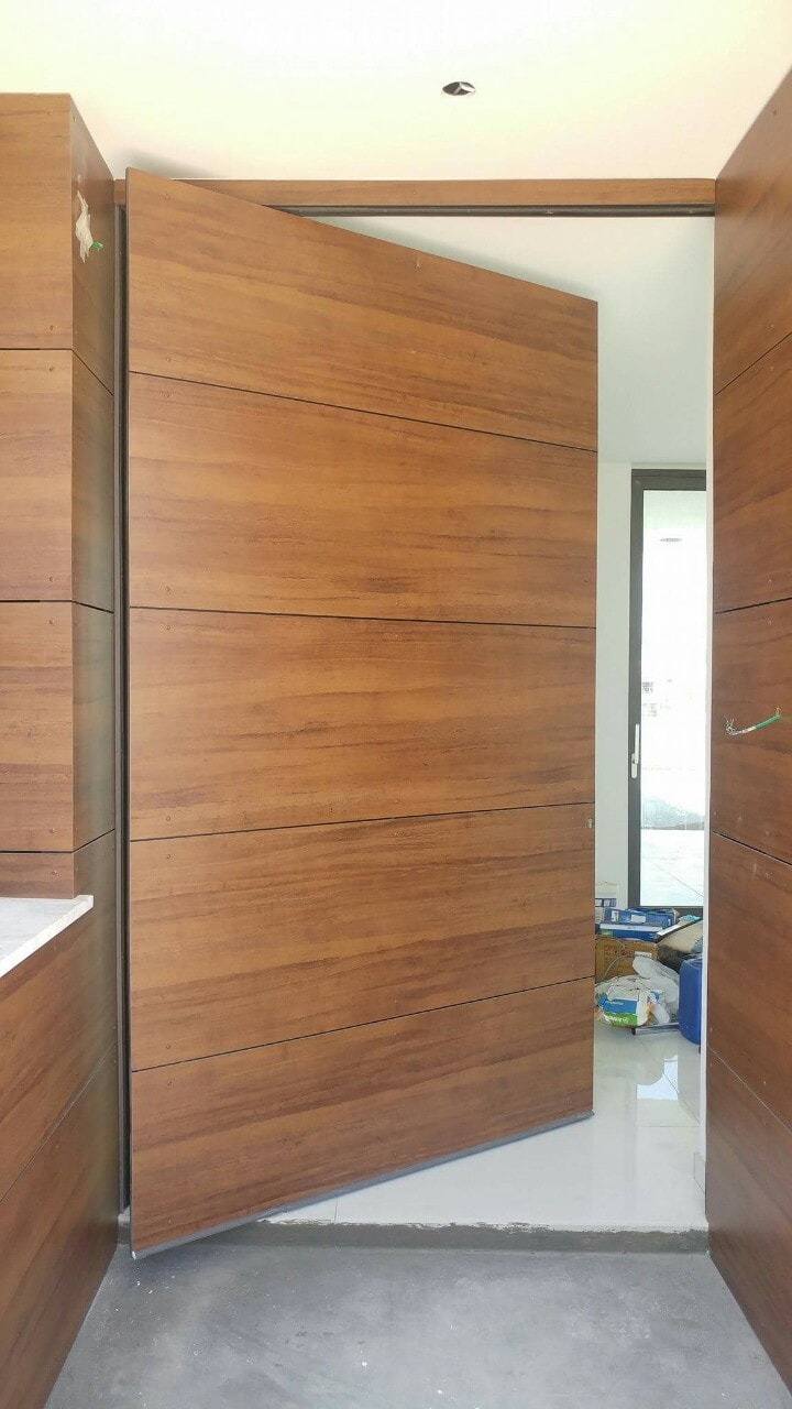 Θύρα εισόδου επενδυμένη με ξύλο.